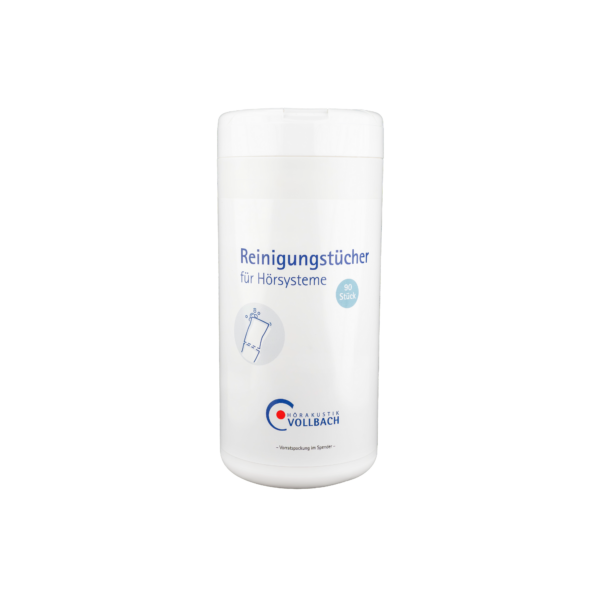 90 feuchte Reinigungstücher im praktischen Spender zur effektiven Reinigung von Hörsystemen und Ohrpassstücken.