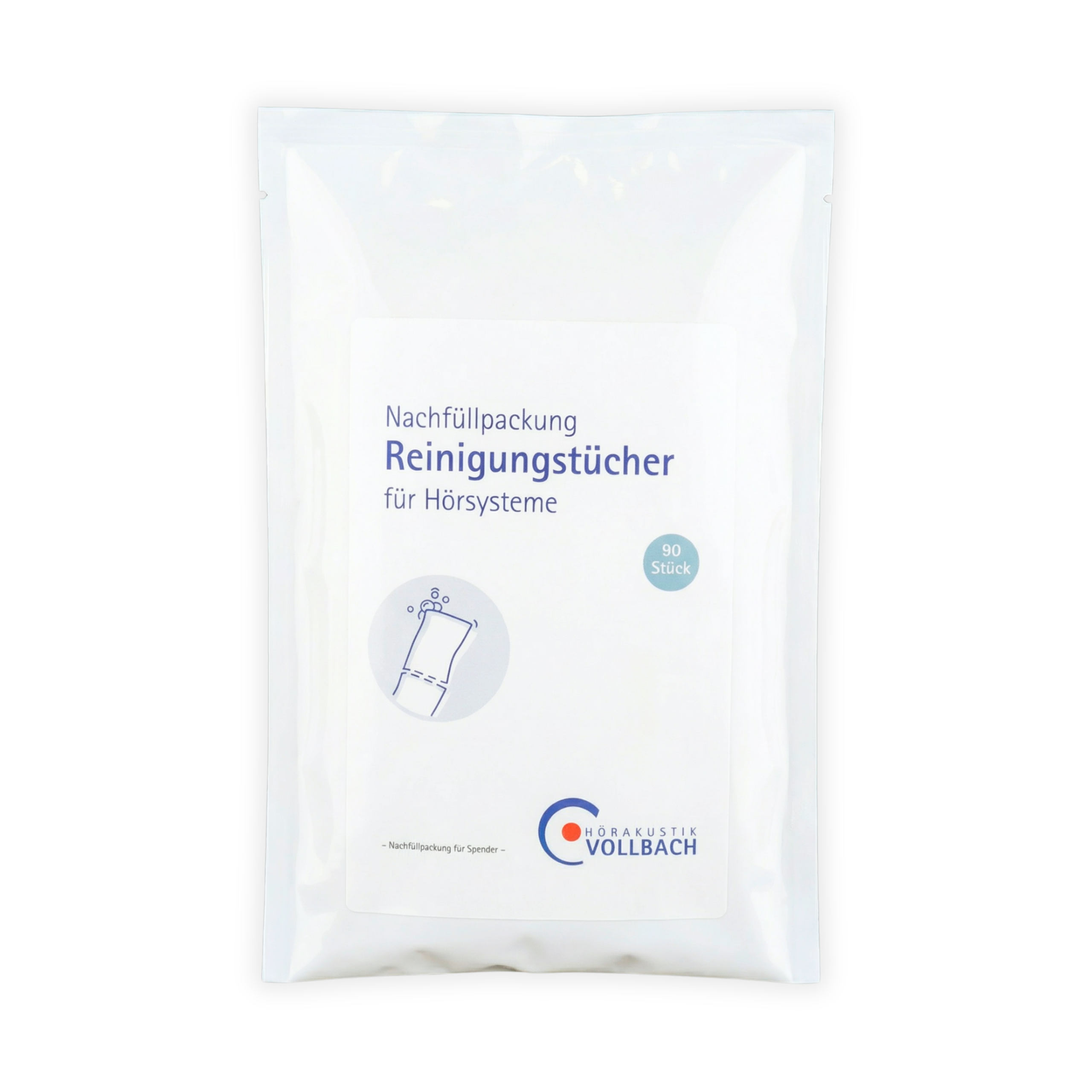 90 feuchte Reinigungstücher zur effektiven Reinigung von Hörsystemen und Ohrpassstücken.